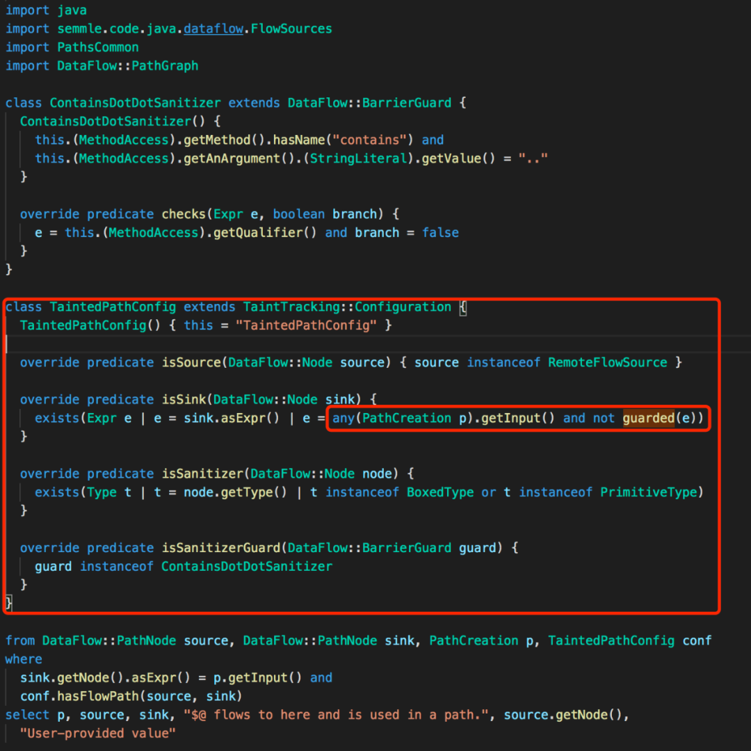 在上一部分的讲解中,我们了解到了数据流必须使用DataFlow::xxx和TaintTracking::configuration,其中conf是对数据流进行配置,而这里,我圈出来的any()方法中的就是对一个sink的约束,他的约束主要在PathCreation类和guarded谓词中。这里重点就是在讲解PathCreation类。