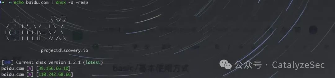 echo baidu.com | dnsx -a -resp