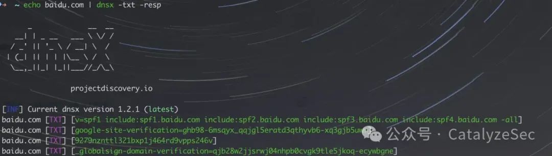 echo baidu.com | dnsx -txt -resp