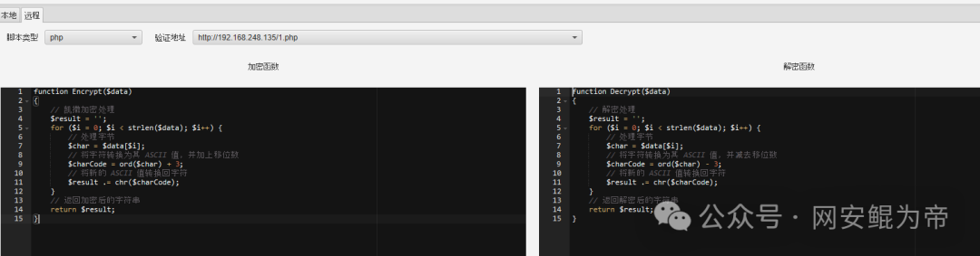 `//解密处理``function Decrypt($data, $shift = 3)``{` `$result = '';` `for ($i = 0; $i < strlen($data); $i++) {` `$char = $data[$i];` `$charCode = ord($char) - 3;` `$result .= chr($charCode);` `}` `return $result;``}`