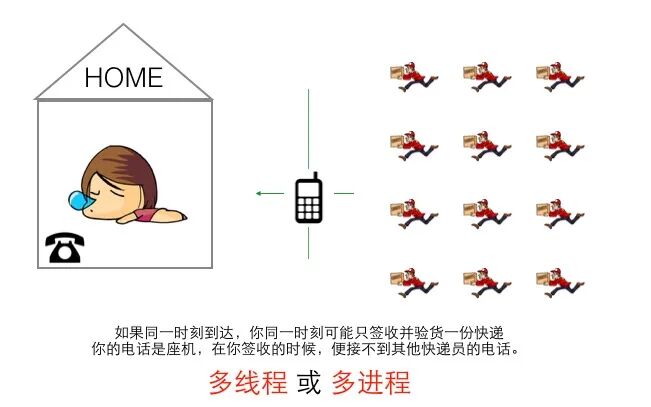 也就是同一时刻,你只能被动的处理一个快递员的签收业务,其他快递员打电话打不进来,只能干瞪眼等待。那么解决这个问题,家里多买N个座机, 但是依然是你一个人接,也处理不过来,需要用影分身术创建多个自己来接电话(采用多线程或者多进程)来处理。