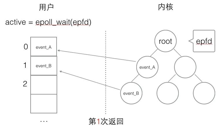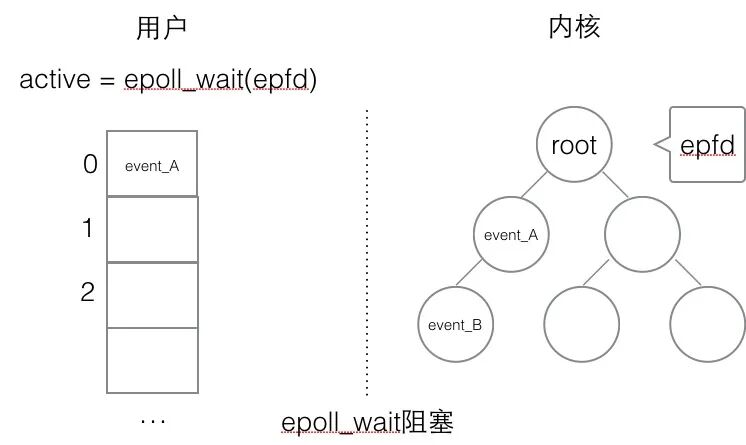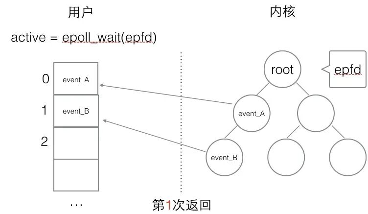 epoll_wait 是一个阻塞的状态,如果内核检测到IO的读写响应,会抛给上层的epoll_wait, 返回给用户态一个已经触发的事件队列,同时阻塞返回。开发者可以从队列中取出事件来处理,其中事件里就有绑定的对应fd是哪个(之前添加epoll事件的时候已经绑定)。