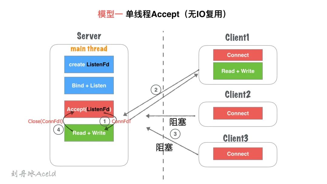 模型一:单线程Accept(无IO复用) 支持了并发的特性。server 处理业务内聚程度高,客户端无论如何写,服务端均会有一个线程做资源响应。缺点: