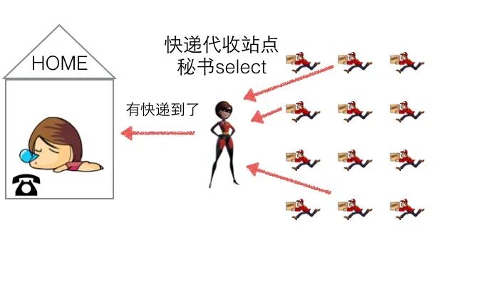 我们可以开设一个代收网点,让快递员全部送到代收点。这个网店管理员叫select。这样我们就可以在家休息了,麻烦的事交给select就好了。当有快递的时候,select负责给我们打电话,期间在家休息睡觉就好了。
