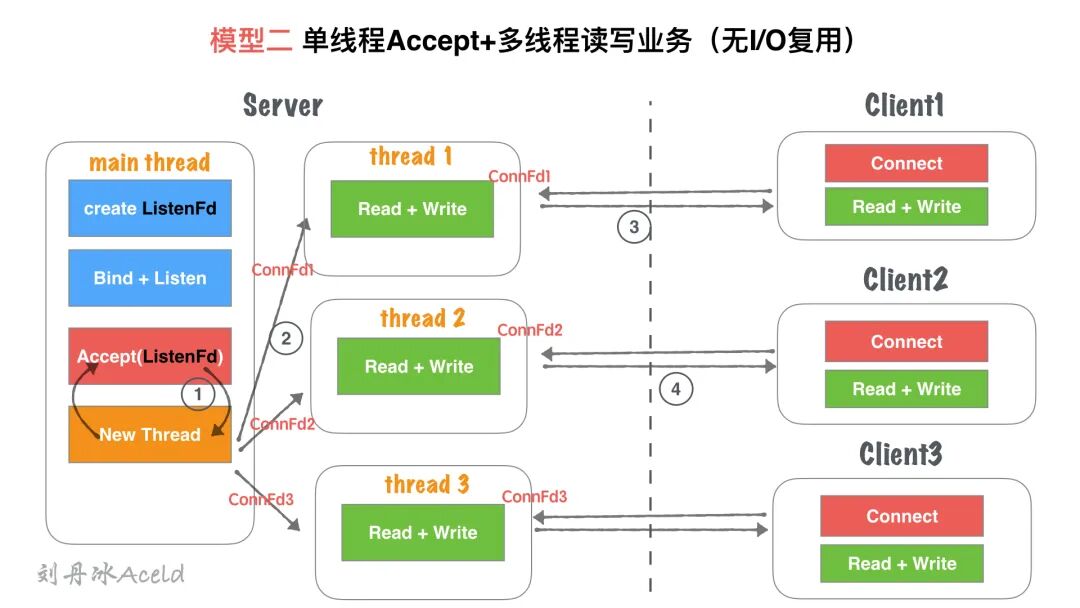 ① 主线程 main thread 执行阻塞Accept,每次客户端Connect链接过来, main thread 中accept响应并建立连接