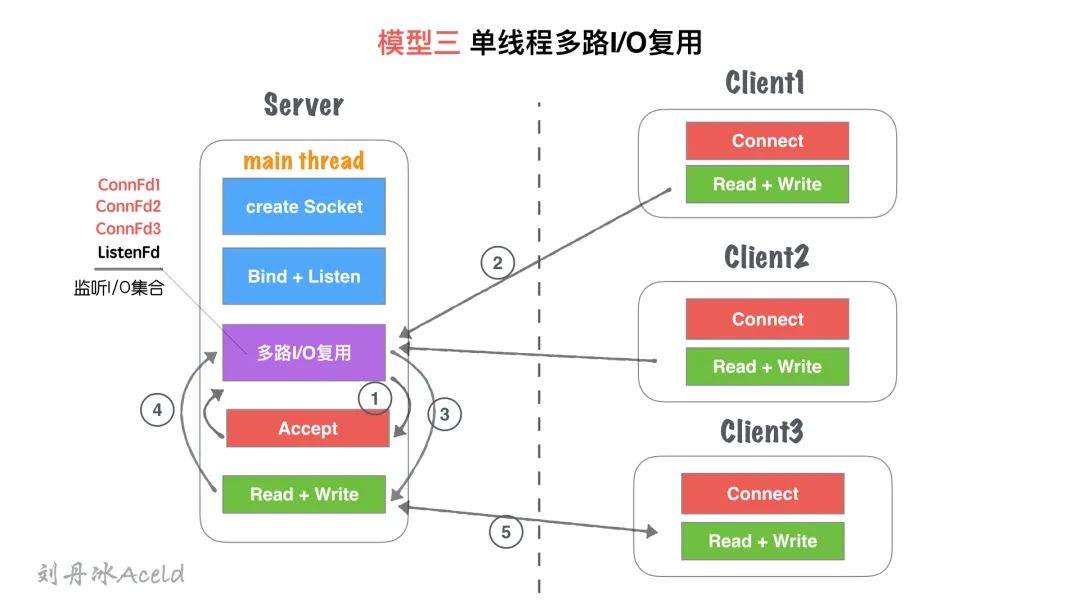 ④ 等到Server处理完一个连接的 Read+Write 操作,继续回到 多路I/O复用机制 阻塞,其他链接过来重复 ②、③流程。