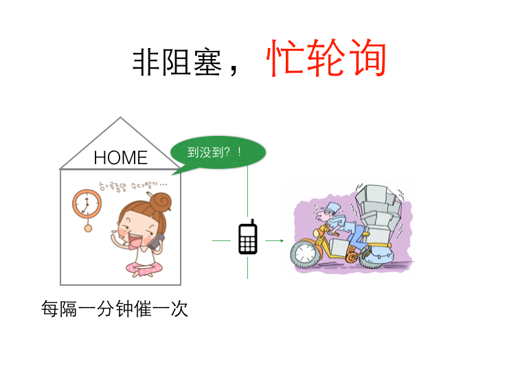 非阻塞,忙轮询场景: 你性子比较急躁, 每分钟就要打电话询问快递小哥一次, 到底有没有到,快递员接你电话要停止运输,这样很耽误快递小哥的运输速度。