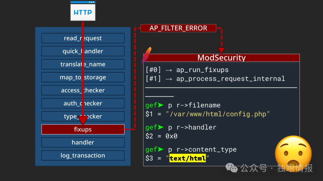 首先,第一个是基于Filename 字段上的Confusion,从字面上来看 r->filename 应该是一个文件系统路径,然而在Httpd 中,有些模块会把它当成网址来处理。如果在HTTP 请求的上下文中,有些模块把 r->filename 当成文件路径,而其他模块将它当成网址,这其中的不一致就会造成安全上的问题!