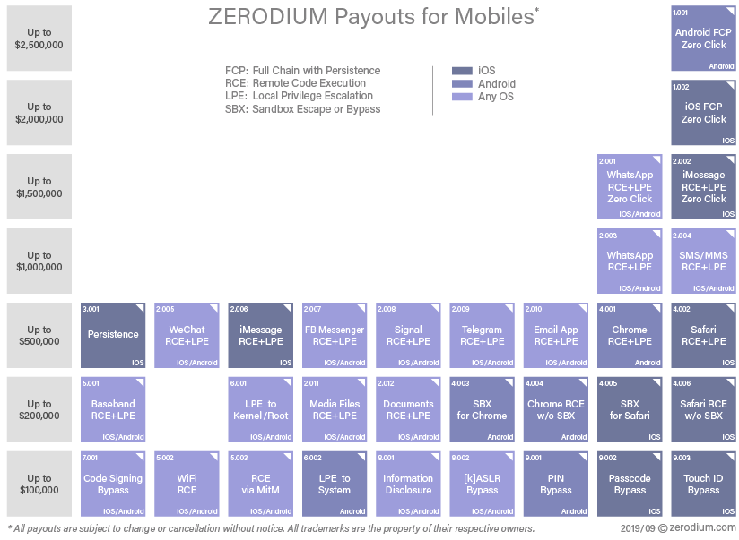Zerodium 官网上,清晰标注着各种漏洞的价格,主打一个童叟无欺。(这里面有一家中国公司,各位可以找找看是谁~