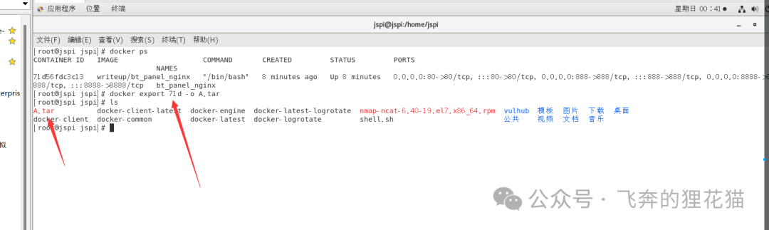部署完毕后,本地测试无误后,进行导出。docker export 镜像id -o 文件名