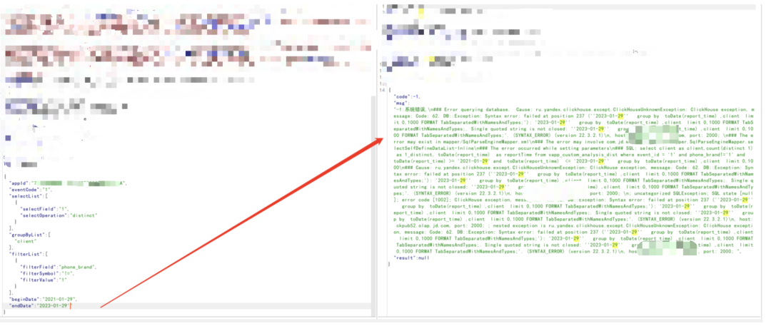 1)对于存在筛选的功能,会存在一些时间参数以及排序,此种情况下,使用单引号拼接进行注入判断,最明显的为时间参数,报错注入时会把sql语句报出,盲注则会返回“系统错误”以及不同的响应长度等信息,如: