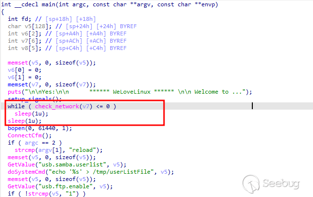 这里有一个 check_network 函数被循环调用,并且还有 sleep(1u) 的延迟,直到返回值大于0。目的可能是等待网络连接成功后再执行后续操作,这样就会陷入死循环。