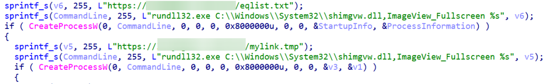 WPS漏洞和Foxmail漏洞所投递的载荷,都是同一种木马文件。该木马是一个dll文件。运行后,会滥用合法的windows的照片库查看器组件shimgvw.dll,通过其中的函数ImageView_Fullscreen,从远程服务器上下载文件eqlist.txt和mylink.tmp。