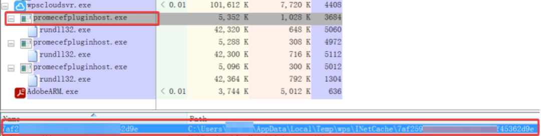 WPS程序会调用wpscloudsvr.exe来执行“轻办公”命令,最终通过promecefpluginhost.exe负责命令的执行,加载前一阶段下载好的载荷文件。