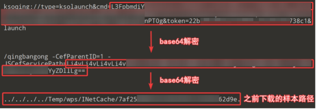 攻击者破解了WPS的token生成逻辑,从而能够构造出“合法”的恶意“轻办公”链接,并借助其执行恶意操作。该“轻办公”链接经过解码后,可以看出其功能是运行之前下载的文件。