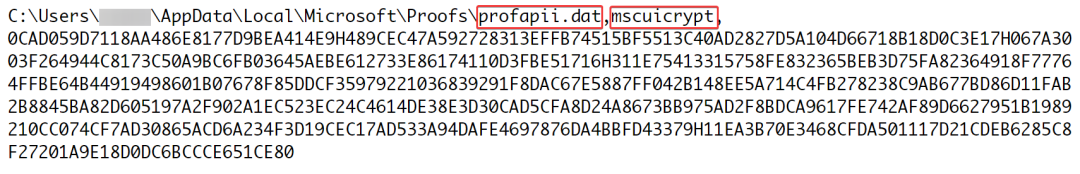 该地址返回的内容不是一个cab文件,而是加密的数据。数据解密后如下图所示,该数据用于调用profapii.dat文件中的导出函数mscuicrypt,并包含需要传递给mscuicrypt函数的参数。