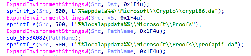 文件eqlist.txt中保存了加密数据。该木马所使用的加密算法,是一个经过修改的base64编码算法。样本随后会将该文件解密,并释放出两个后续载荷文件,保存到%appdata%\Microsoft\Crypto\crypt86.da和%localappdata%\Microsoft\Proofs\profapii.da。