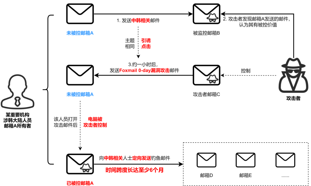 攻击者发送与中韩关系相关的钓鱼邮件,包括利用前面所述的0day漏洞,从而触发恶意载荷。