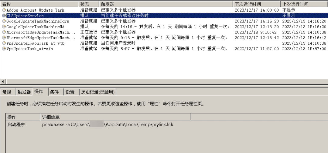 mylink.tmp是一个lnk文件,木马会将其复制到%temp%\mylink.lnk,并创建计划任务CLSUpdateService,滥用合法系统程序pcalua.exe执行该文件。