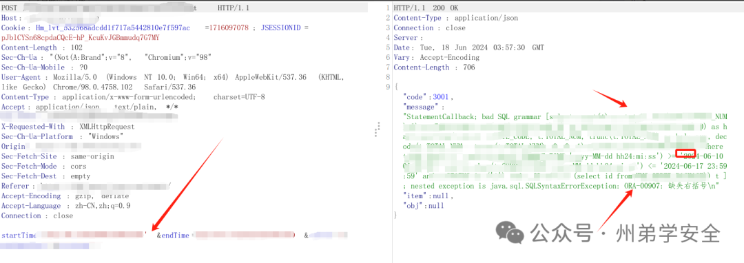 某接口通过startTime和endTime确定开始和结束时间,但是用户可通过前端进行操作产生报错注入