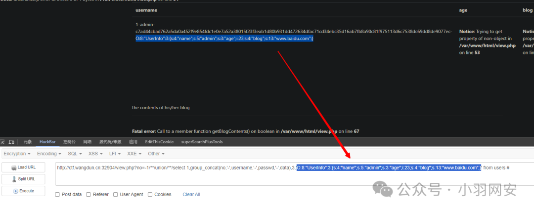8echo serialize($res); // O:8:"UserInfo":3:{s:4:"name";s:5:"mochu";s:3:"age";i:7;s:4:"blog";s:29:"file:///var/www/html/flag.php";}