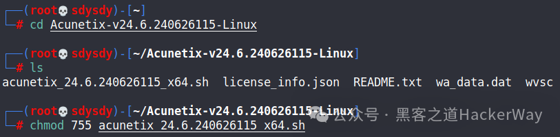 1┌──(root㉿sdysdy)-[~/桌面] 2└─# cd Acunetix-v24.6.240626115-Linux 3┌──(root㉿sdysdy)-[~/桌面/Acunetix-v24.6.240626115-Linux] 4└─# ls 5acunetix_24.6.240626115_x64.sh license_info.json README.txt wa_data.dat wvsc 6┌──(root㉿sdysdy)-[~/桌面/Acunetix-v24.4.240626115-Linux] 7└─# chmod 755 acunetix_24.4.240626115_x64.sh