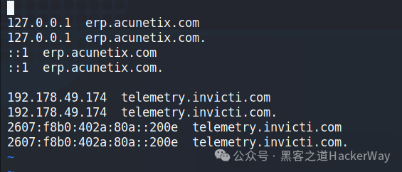 1127.0.0.1 erp.acunetix.com 2127.0.0.1 erp.acunetix.com. 3::1 erp.acunetix.com 4::1 erp.acunetix.com. 5 6192.178.49.174 telemetry.invicti.com 7192.178.49.174 telemetry.invicti.com. 82607:f8b0:402a:80a::200e telemetry.invicti.com 92607:f8b0:402a:80a::200e telemetry.invicti.com.