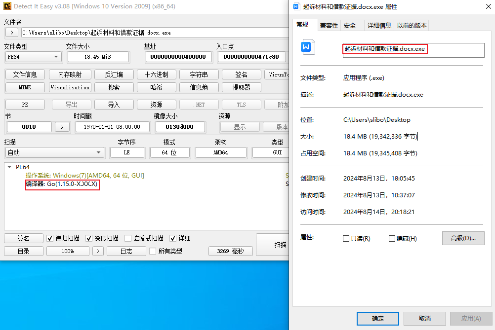 样本为go语言编写,图标伪装为word文件,文件名伪装文档类型诱导目标用户点击。
