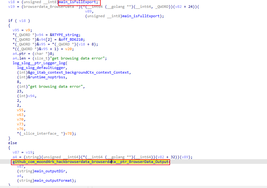 找到浏览器后,通过main_isFullExport函数将浏览器数据全部导出,然后通过ptr_BrowserData_Output函数将数据进行输出: