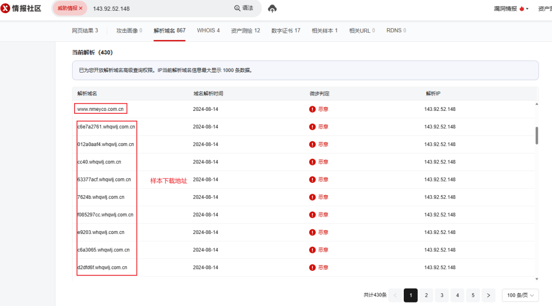 通过对攻击者恶意样本下载域名whqwlj.com.cn的子域名进行拓线,其解析IP都为143.92.52.148,同时该IP还解析www.nfmuyw.com.cn、www.nmeyco.com.cn。和whqwlj.com.cn比较,其顶级域名一致,且解析同一IP资产: