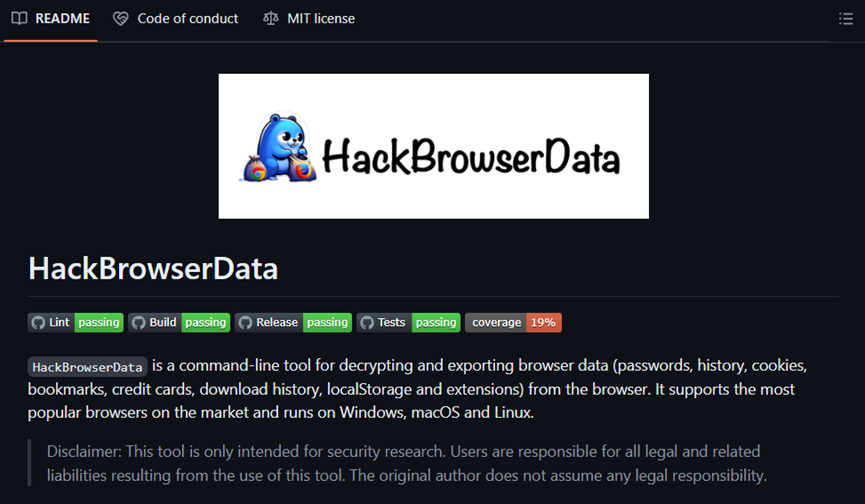 下载的样本文件为开源项目HackBrowserData自编译版本,HackBrowserData是一个命令行工具可以用于解密和导出浏览器数据(密码,历史记录,cookies信息,凭证,书签,下载历史信息,本地存储和扩展等),支持主流的浏览器和操作系统平台。
