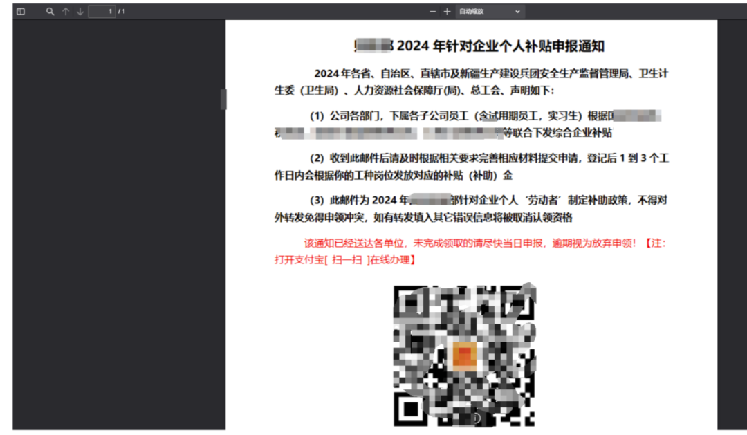 经分析确认,此次攻击发起者为GanbRun黑产团伙。该团伙于2022年3月被微步情报局首次披露,至今仍处于高活跃状态,已形成了成熟的钓鱼诈骗流程。他们常常伪装为“财务”、“人力”等角色,以社保、公积金、个人所得税、劳动补贴等福利补贴为诱饵,大量发送携带二维码的钓鱼邮件。受害者在扫描这些二维码后,就会跳转到伪造的政府网站或者银行卡信息收集页面,进而导致银行卡、手机号、密码和身份证号等敏感个人信息甚至银行存款被盗。