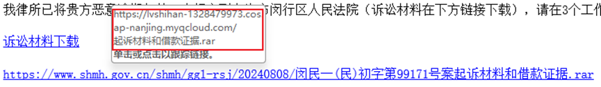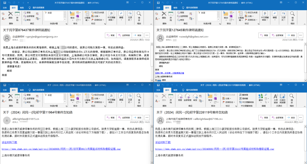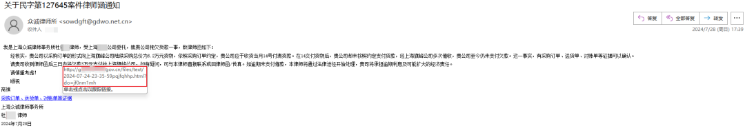 2024年7月,微步情报局发现GanbRun针对大量客户高频率发送大量的钓鱼邮件,邮件主题通常伪装为上海某律所律师,代理小额贷款公司或者供应商公司向受害者索取贷款或者货款,内容为律师函之类,邮件中包含链接地址: