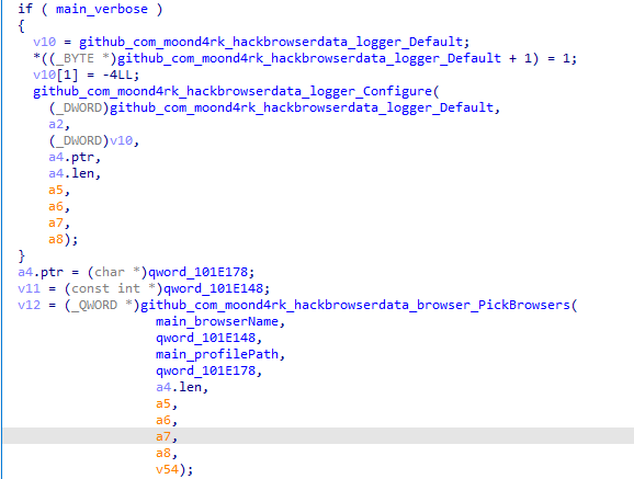 对比源码,攻击者新增了main_Execute_func1函数,该函数不需要命令行参数,而通过可执行文件而直接运行,函数运行后初始化logger,然后调用PickBrowsers来寻找浏览器。