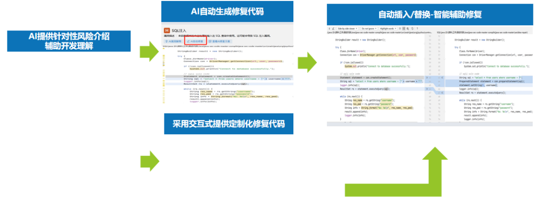 传统的SAST产品提供通用性的缺陷修复方案和修复代码示例,在用户实际修复时往往遇到修复方法使用不规范、修复示例简单笼统与复杂的实际情况不符等情况,导致用户并不确定缺陷是否被真实修复;开发者安全智能助手通过大语言模型结合缺陷的具体情况和上下文生成可直接应用于缺陷修复的代码修复方案,能够帮助用户更快速、高效地解决问题。