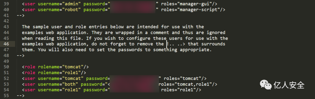 这时候查看扫描结果发现8080端口是开放的,直接读取 /conf/tomcat-users.xml 文件,获取tomcat的密码