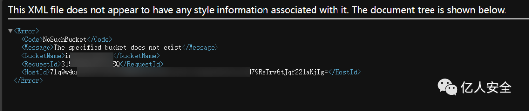 访问该地址发现为 NoSuchBucket ,表示可以接管