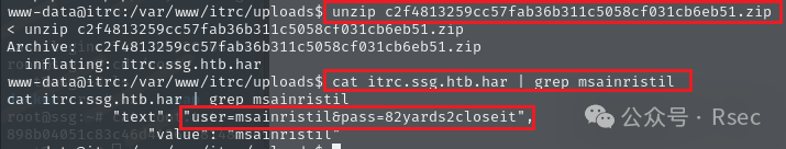 /var/www/html/uploads/c2f48xxxx.zip 文件中有个文件 itrc.ssg.htb.har ,在里面找到 msainristil 用户的密码。