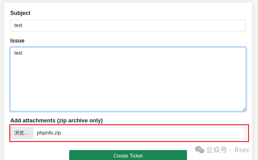 创建ticket,在zip文件里面包含phpinfo.php文件。