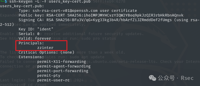 principal是对私钥签名后文件中的一个字段,指示的是登录名,以前文 users_key-cert.pub 为例,可以看到principal的值是zzinter。