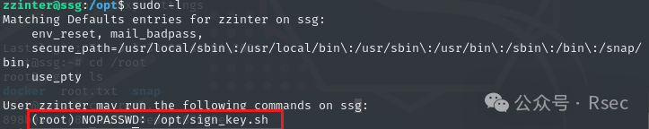 使用 sudo -l 可以发现 zzinter 用户不需要密码就可以执行 sign_key.sh。