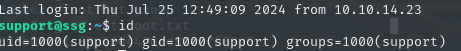 1scp msainristil@ssg.htb:/tmp/suppo* . 2chmod 700 support* 3ssh -i support -p 2222 support@ssg.htb
