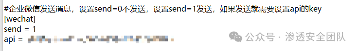 3、配置文件中的[wechat]下的send设置是否使用企业微信机器人发送提醒,设置为0不开启,设置为1开启,如果设置为1,则需要添加企业微信机器人的apikey,如下图所示: