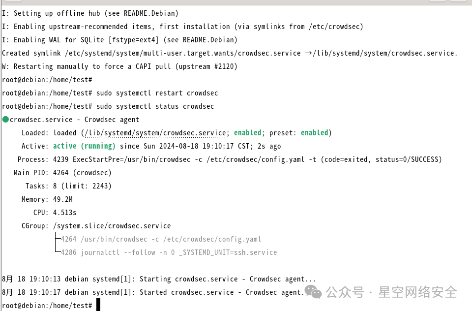 安装过程很短1分钟吧,您可以通过以下命令检查 CrowdSec 是否正常运行,并查看其当前的安全状态: