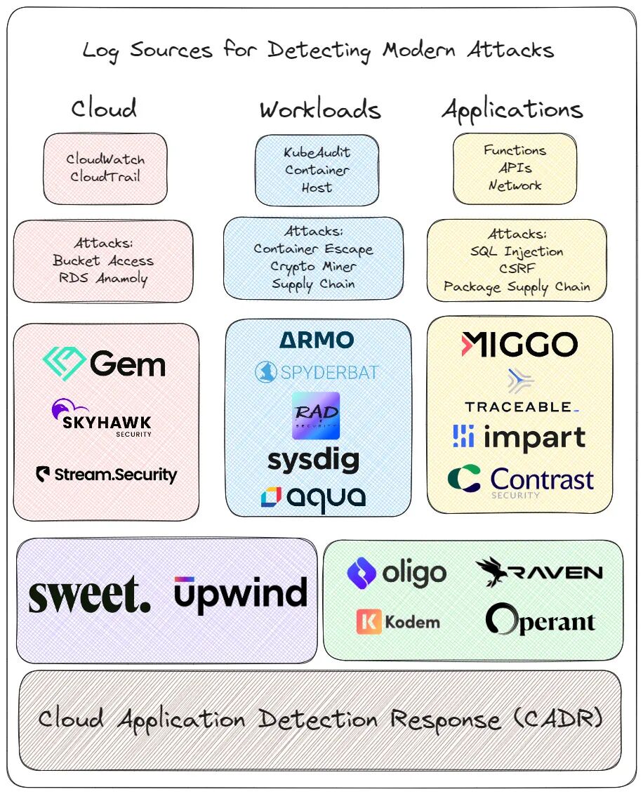 为了可靠地检测新兴攻击,让我们站在SOC的角度思考,找出我们需要哪些日志源。这些日志源中的大多数都没有被纳入 SIEM,因为它们过于冗长且昂贵。此外,它们还需要复杂的逻辑才能将它们串联起来,这就为新的类别创造了机会。无论您使用的是 CNAPP、KDR、CDR 还是其他工具,这些工具都无法进行逐行日志关联,而这正是全面了解攻击情况所必需的。