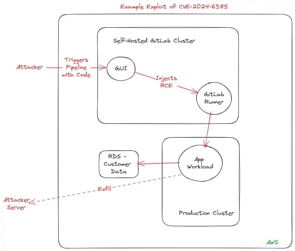 作为攻击示例,让我们选取 GitLab 最近的一次攻击,即 2024 年 7 月 12 日的 CVE-2024-6385。这种攻击允许攻击者以其他用户身份触发管道执行代码。再多的态势管理也无法检测到这种情况的发生,只能告诉你使用的是有漏洞的 GitLab 版本。